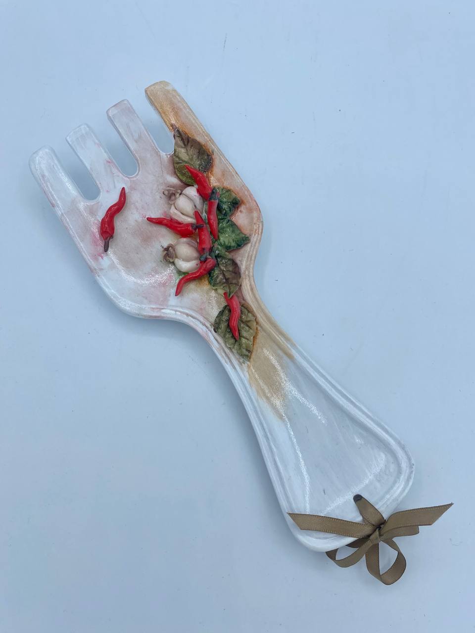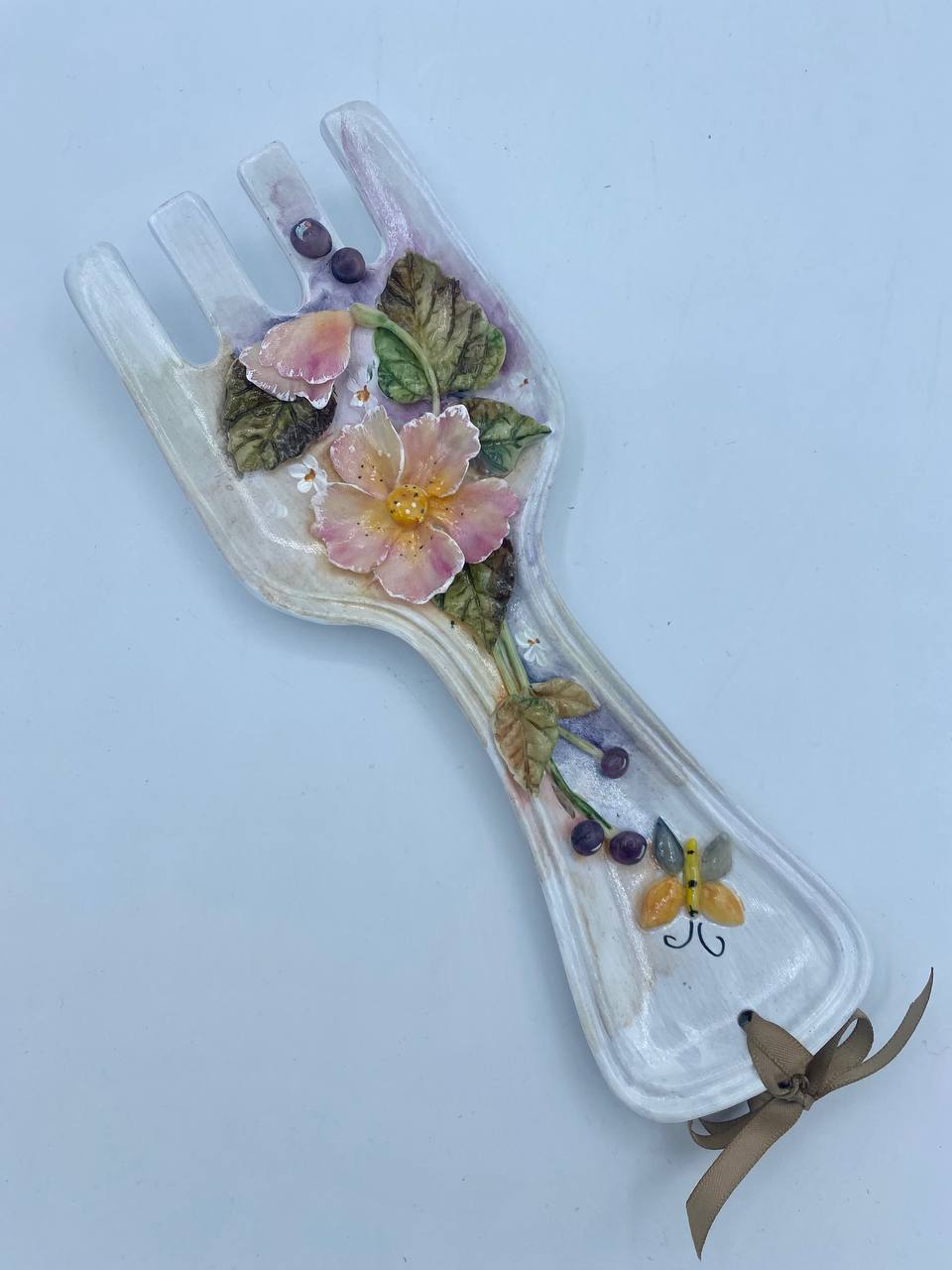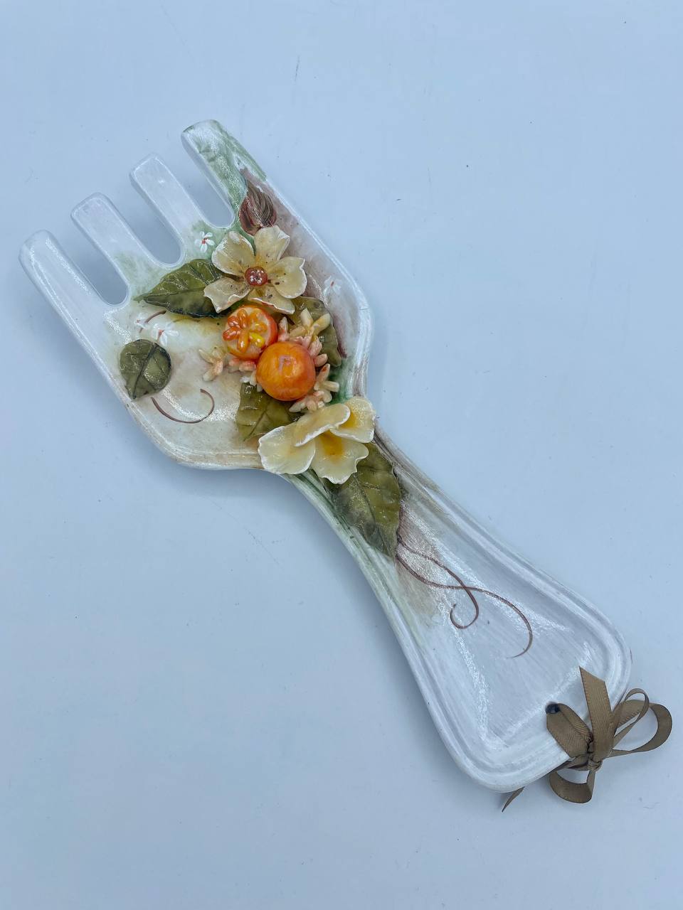 Porta mestoli in ceramica a forma di forchetta con decorazioni in porcellana fredda fatte a mano