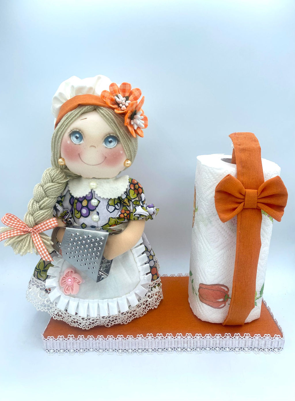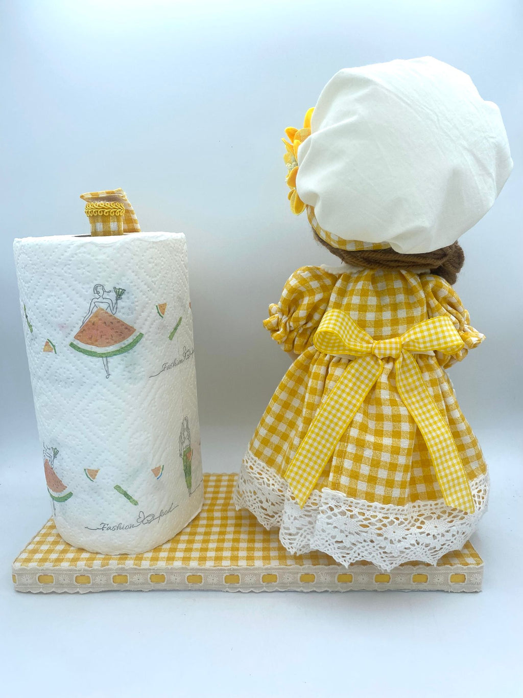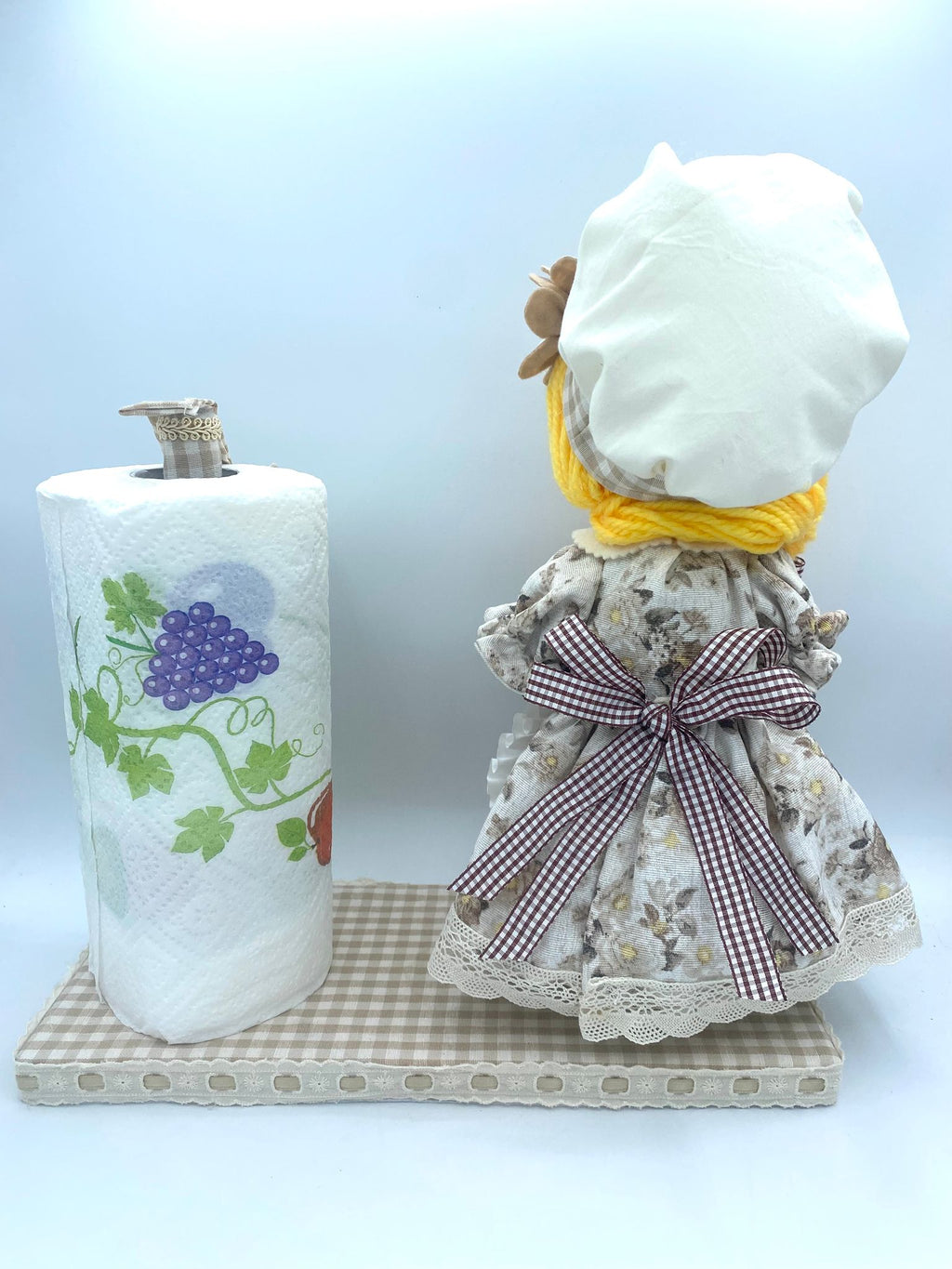 Bambole porta carta da cucina (Scottex) in stoffa realizzate a mano, con base in legno