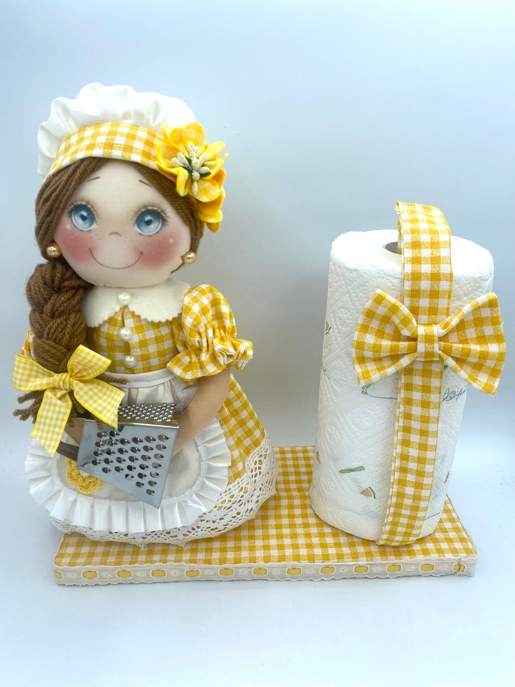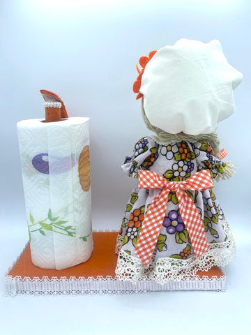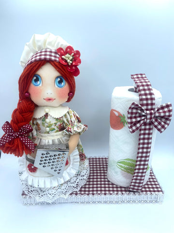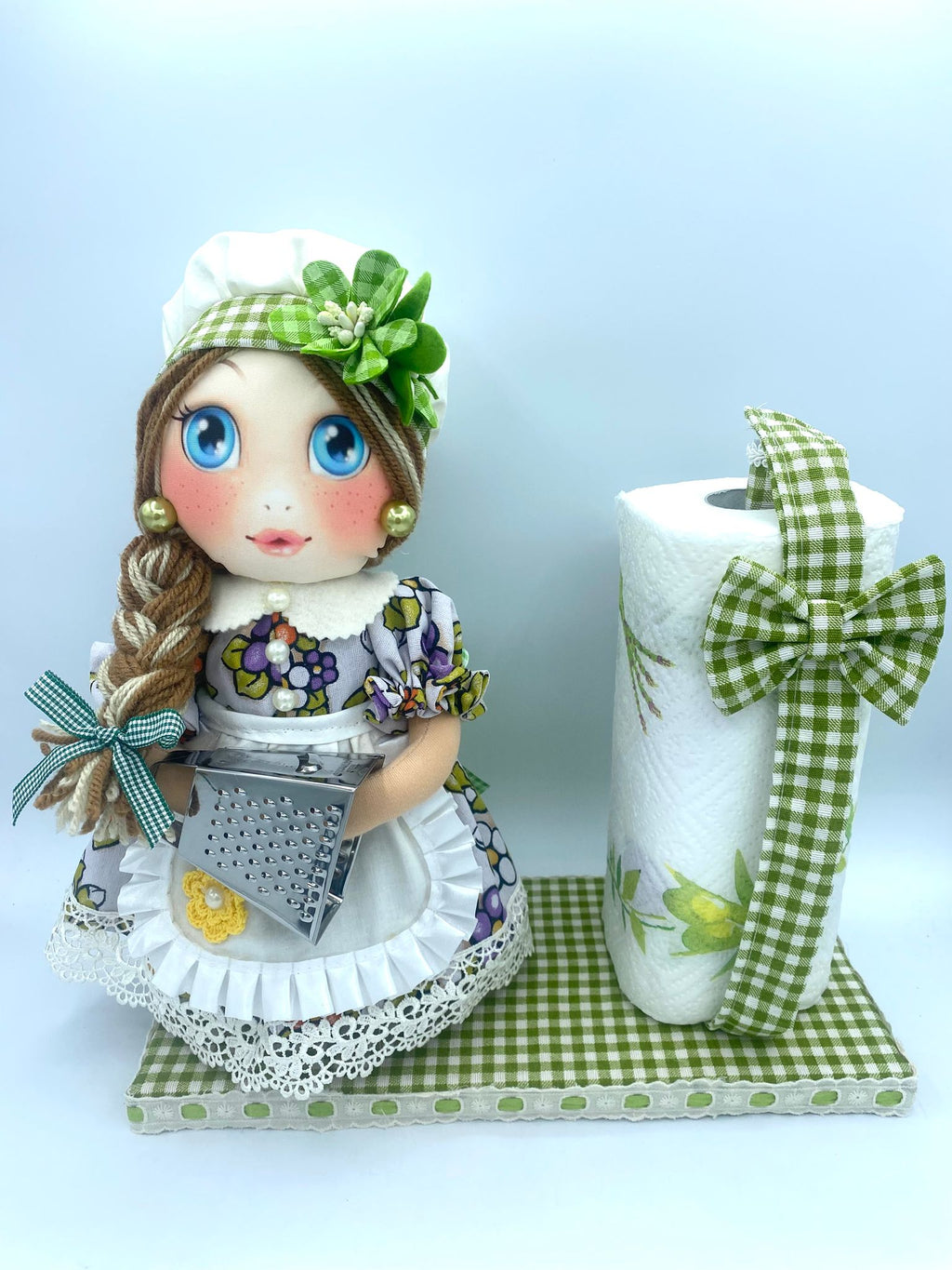 Bambole porta carta da cucina (Scottex) in stoffa realizzate a mano, con base in legno